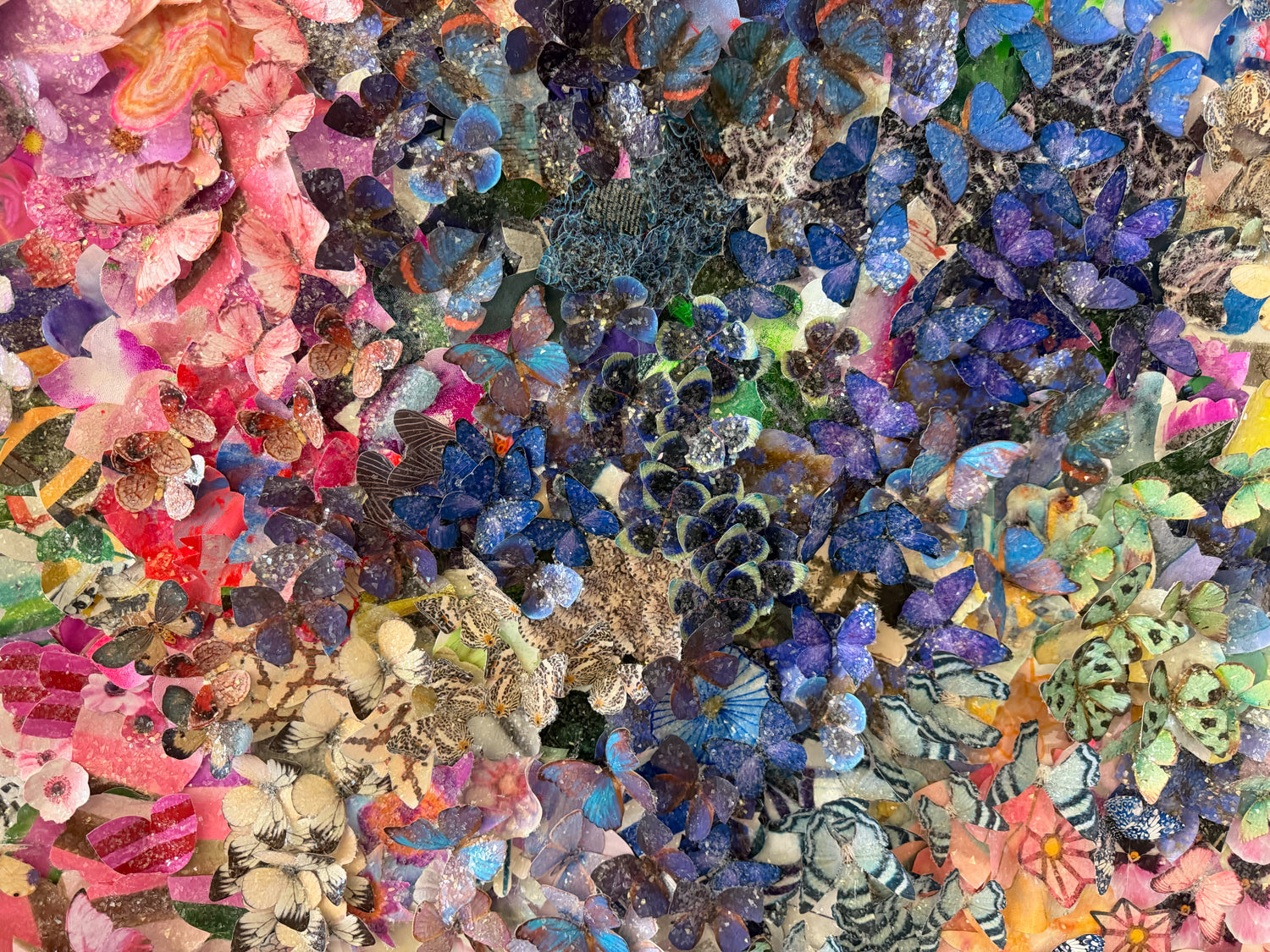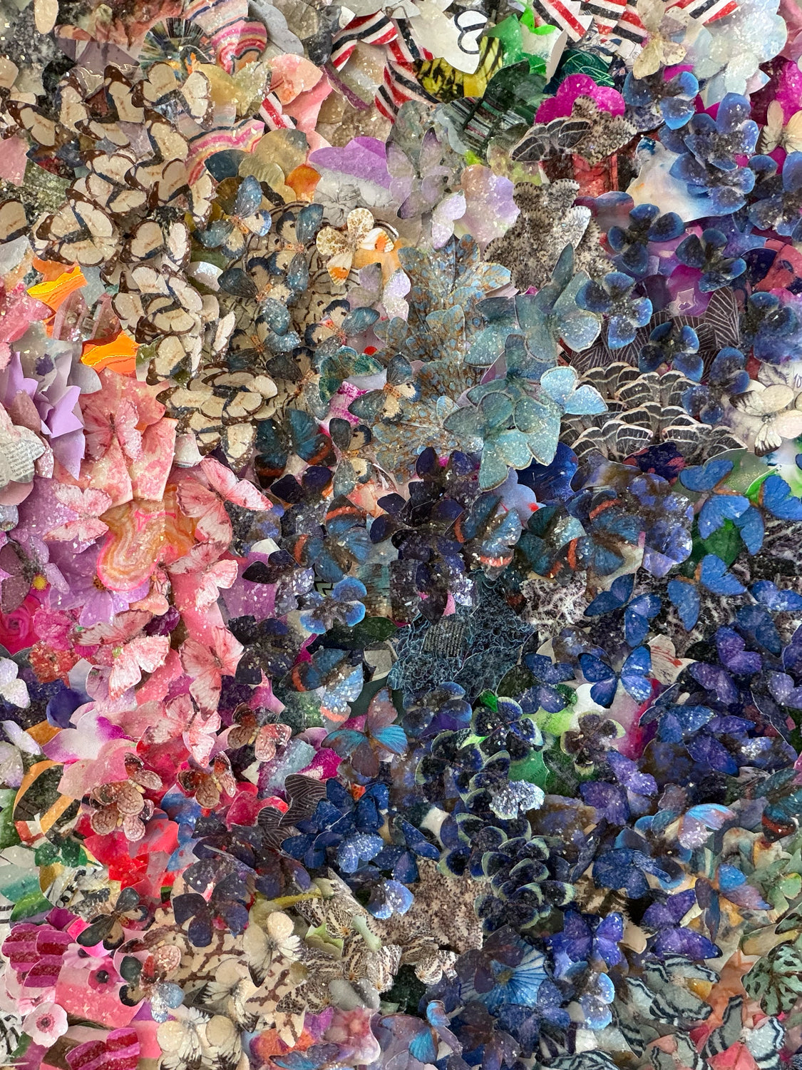 Original, one-of-a-kind collage from Kristi's 3D Bloom series. Created with mixed media including acrylic, illustrations, paper and photography on canvas and coated in cut glass glitter/crystals.