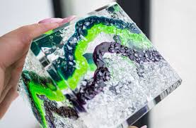 This original work is part of Kristi's Symphonic Atlas series. It's easy to see nature's hand in this series, inspired by snapshots like the swirls of vibrant agate rock, wavy patterns in natural land formations. This sculpture is created on a glossy acrylic cube with vibrant swirls of color and coated cut glass glitter and crystals. It's a combination that creates a luminous, interactive effect, drawing you in every time you walk by.