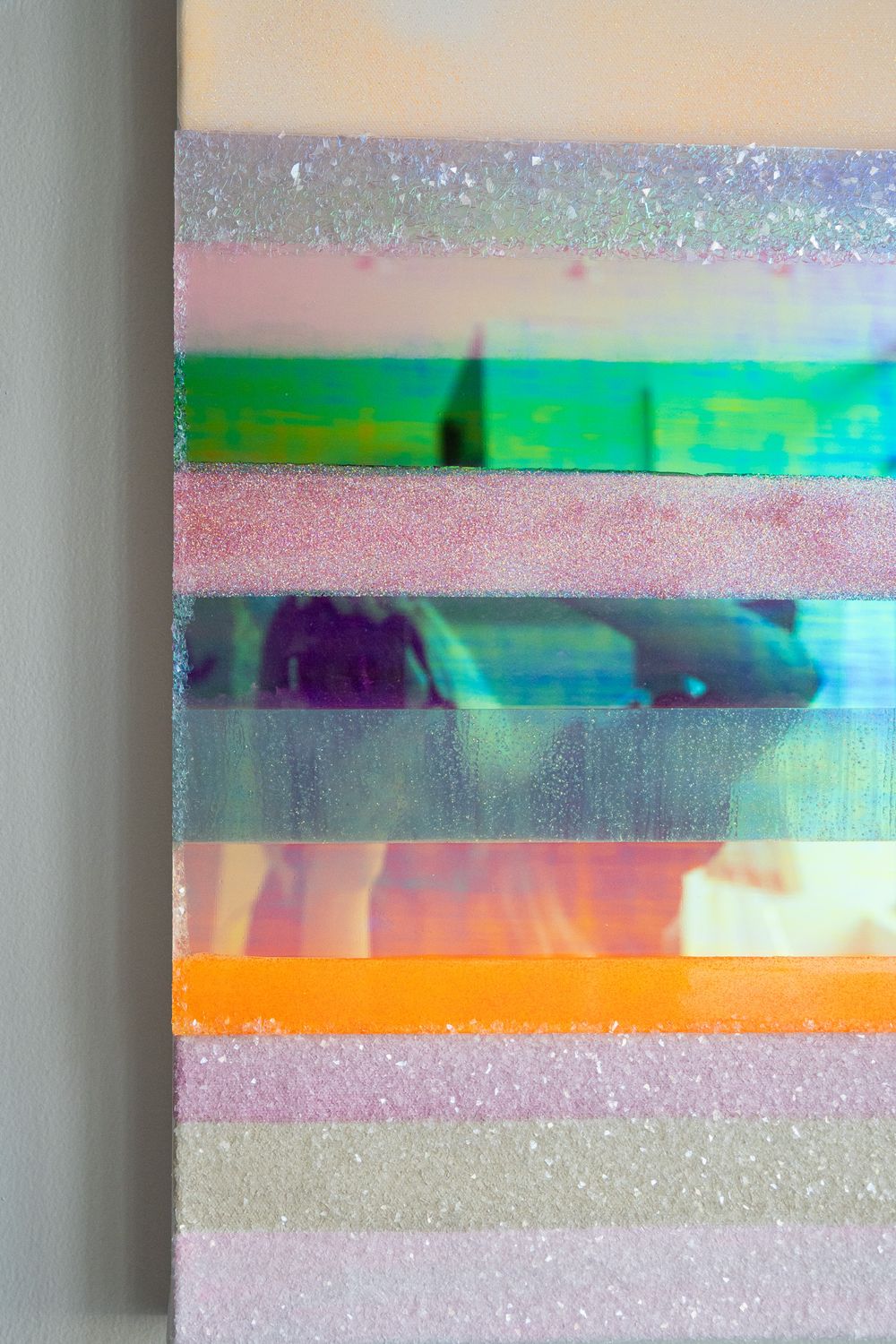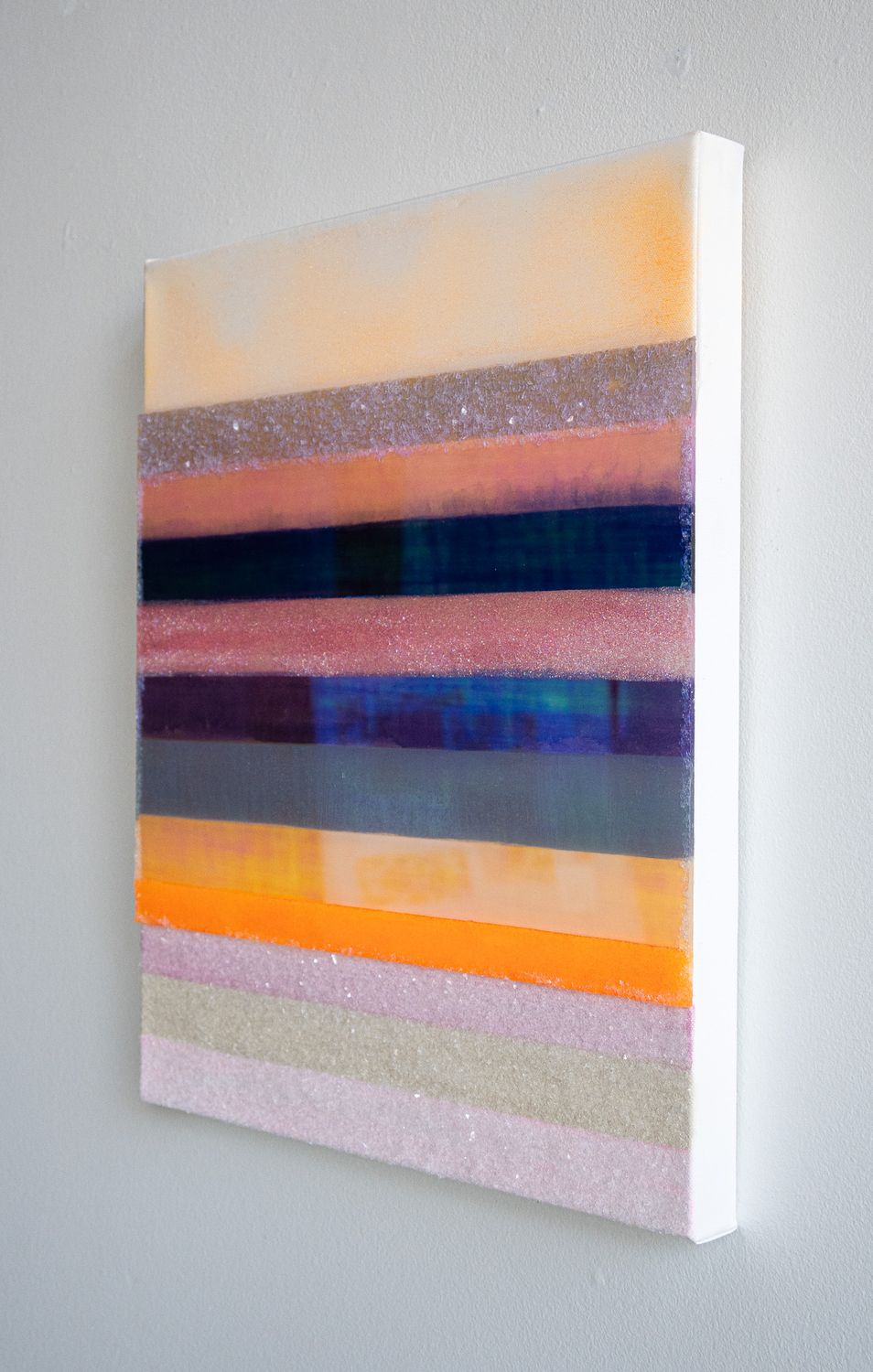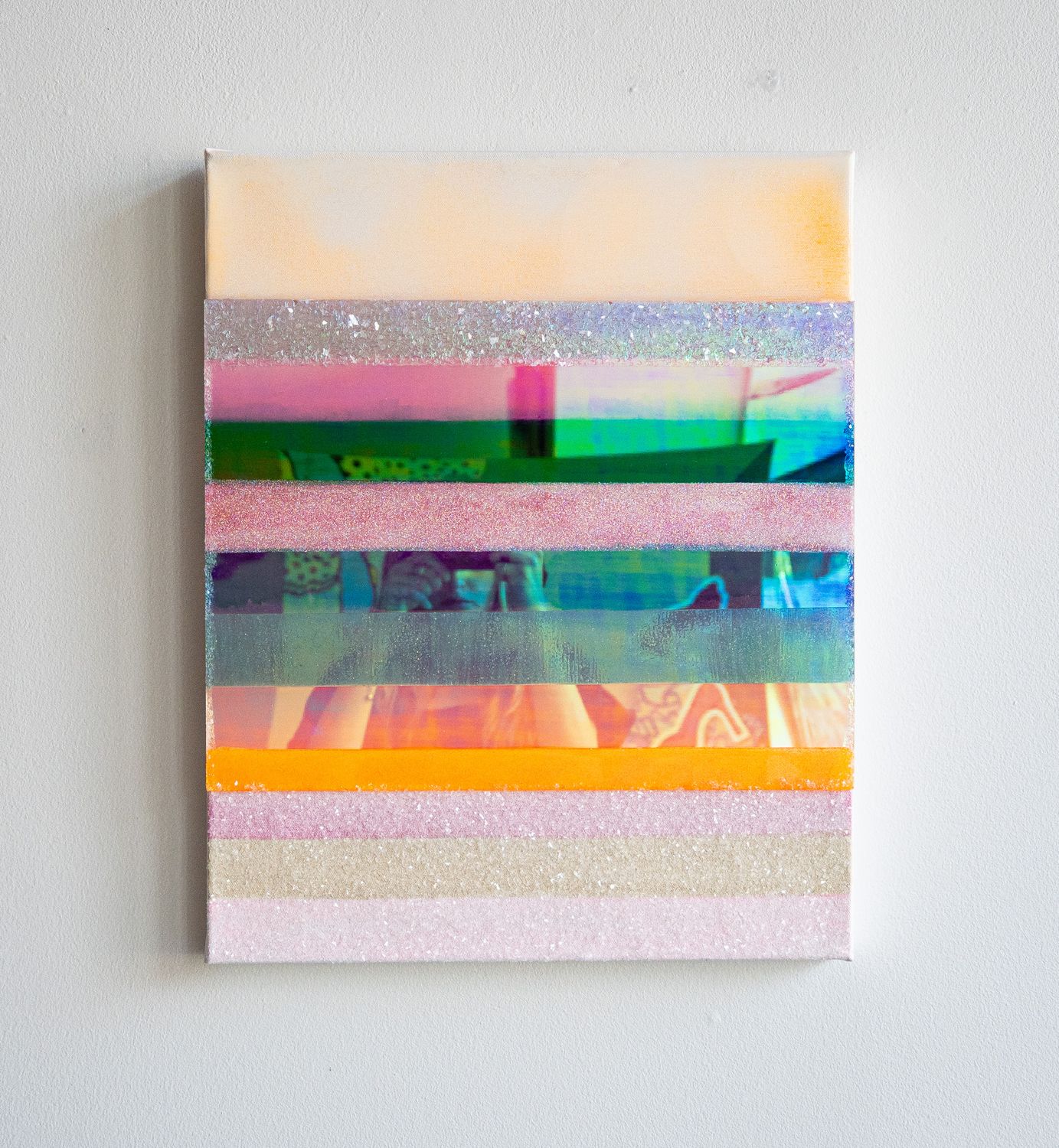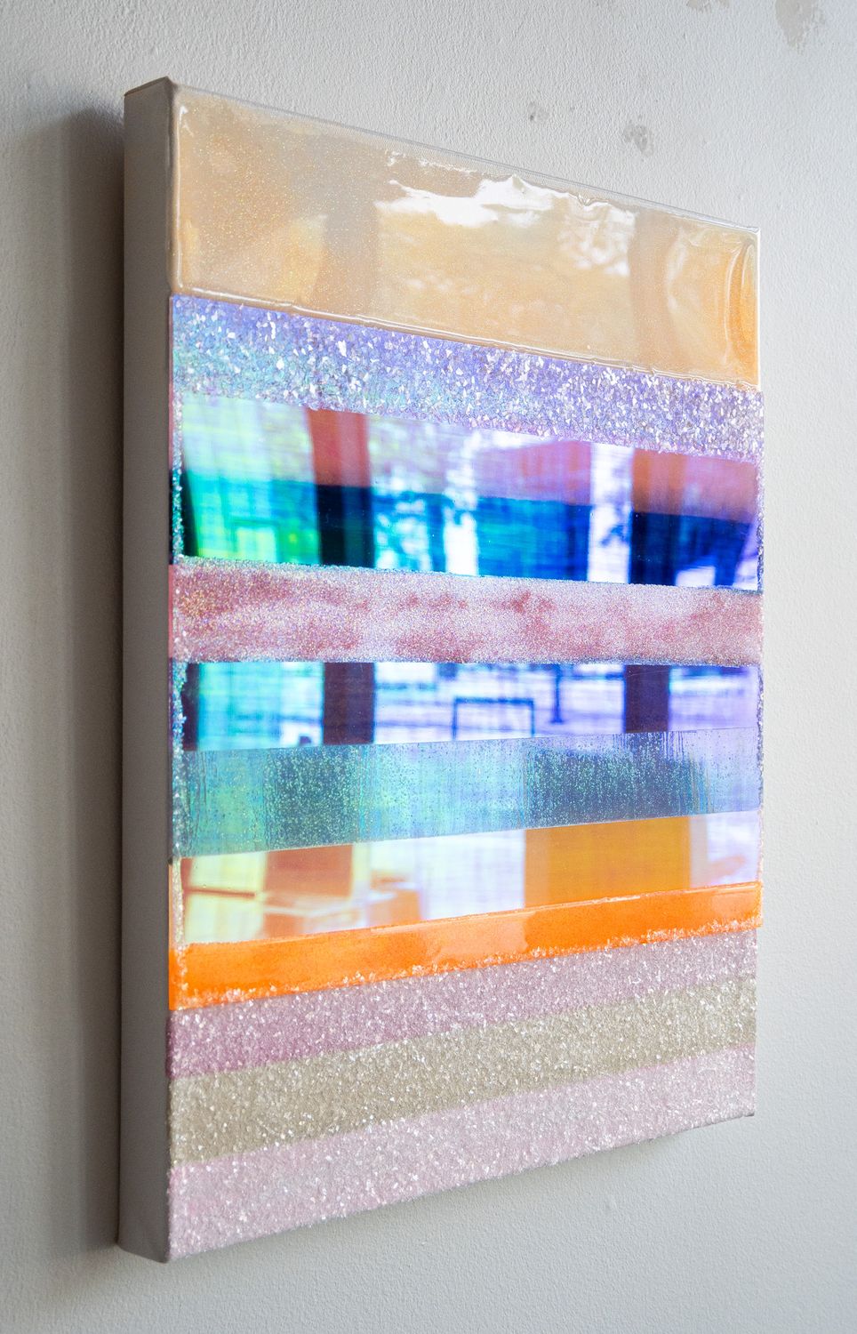 • Mixed media on canvas panel, with iridescent elements and shimmering, cut-glass glitter