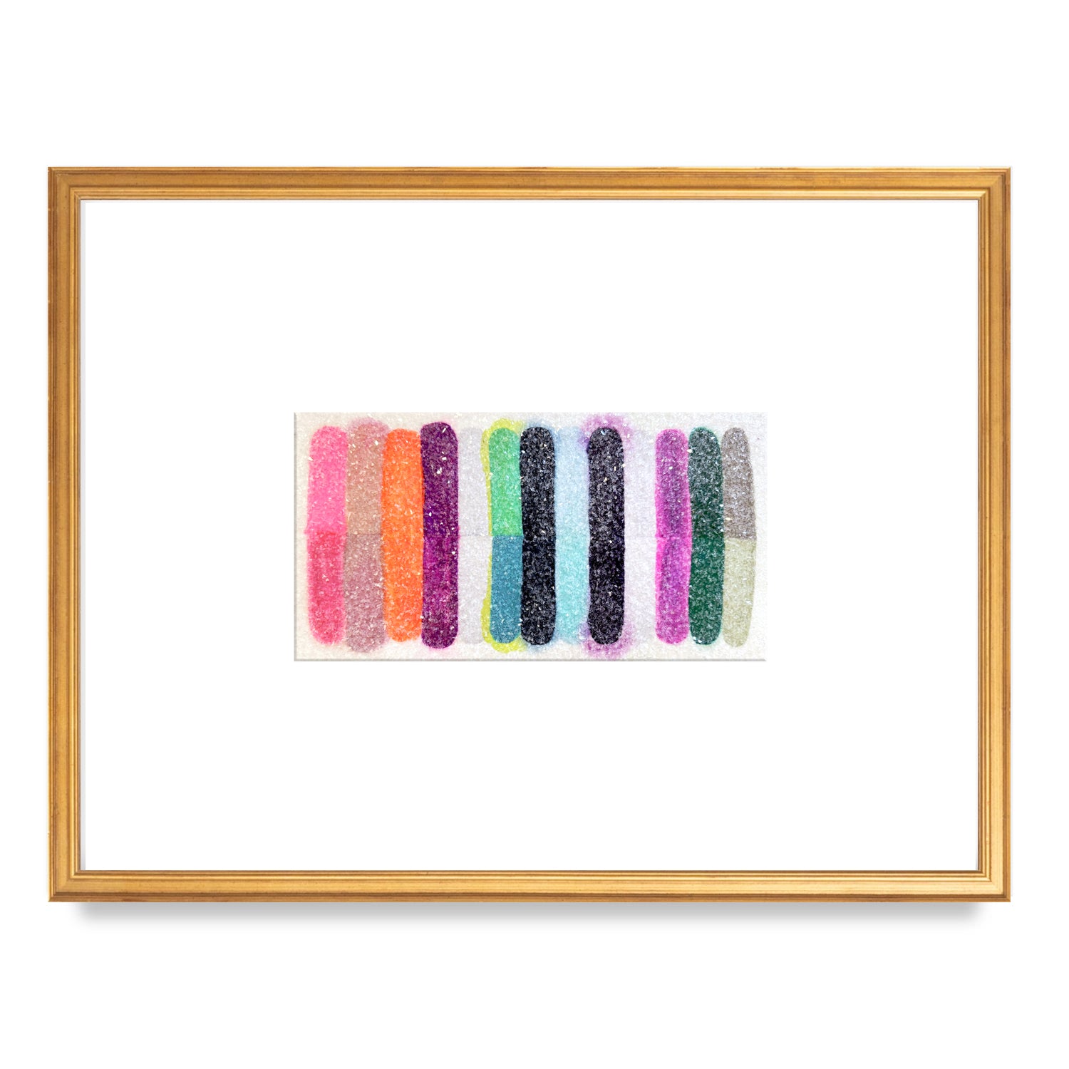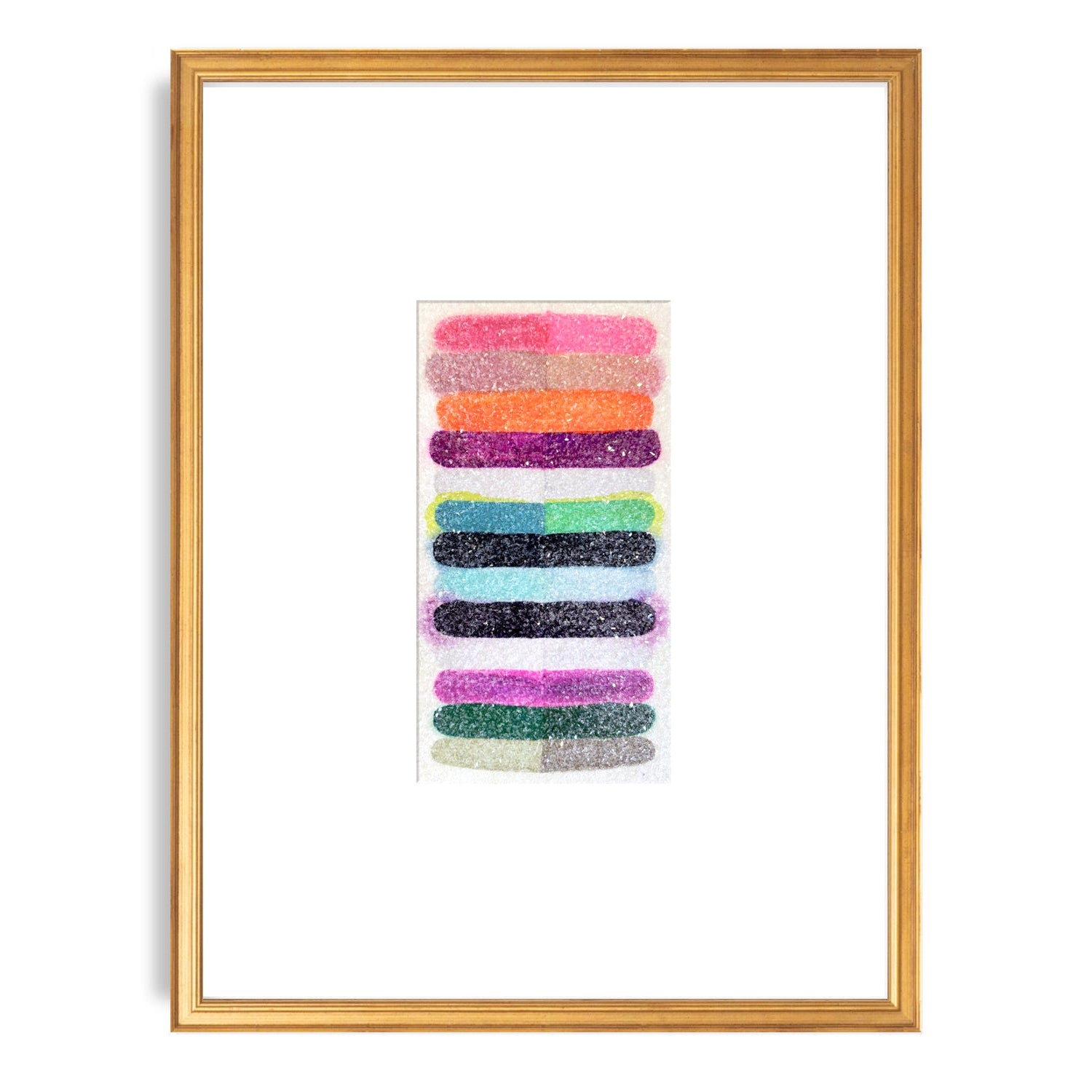 One of Kristi’s most popular series, Chromatic Harmony brings unexpected color combinations together in ways that simply make you smile. Neons juxtapose with faded neutrals; pastels provide a counterpoint to primaries; darker tones live alongside the saturated. Each work is created with mixed media on rice paper, then mounted and coated with layers of cut glass beads and glitter for show-stopping shine.