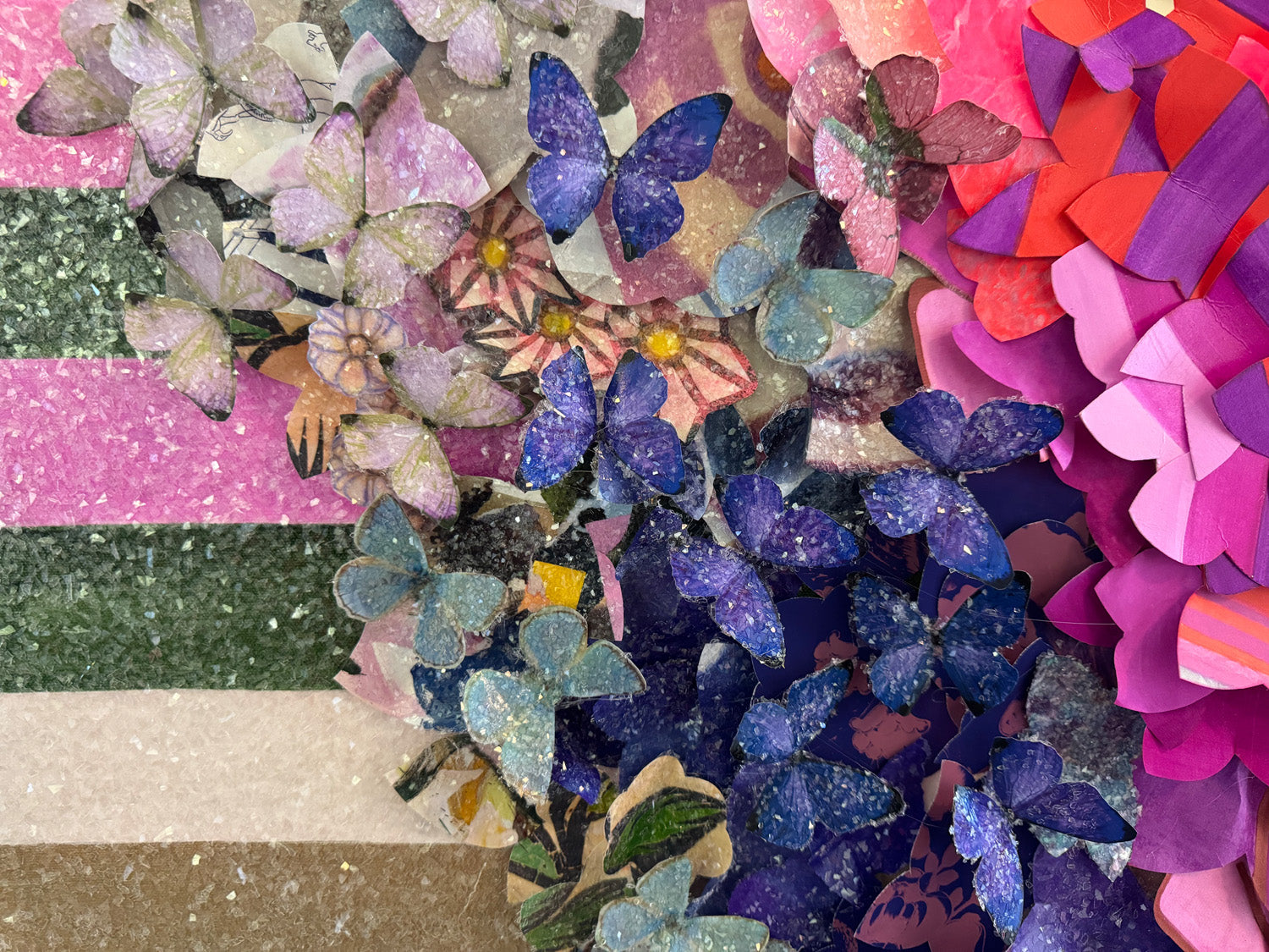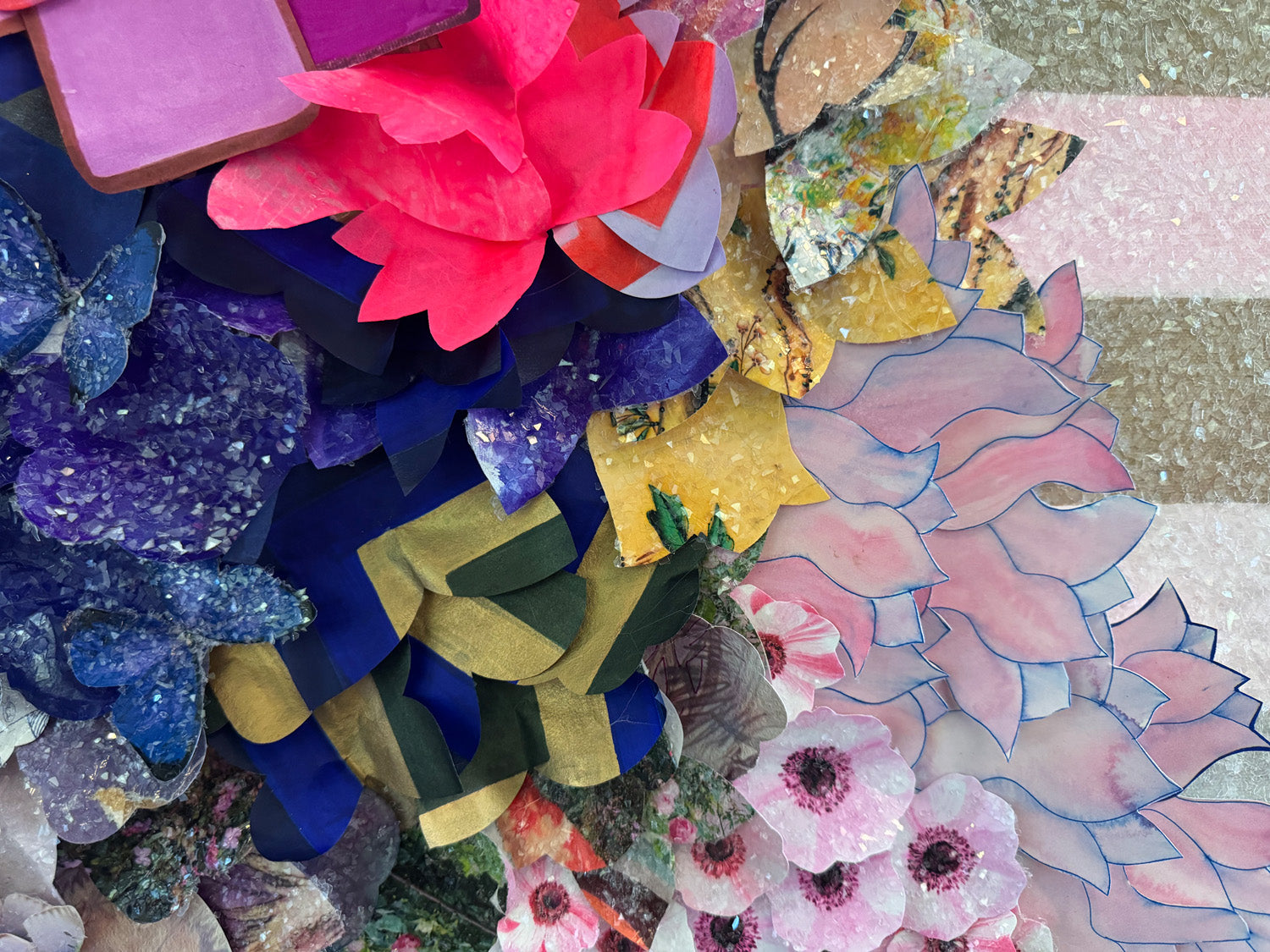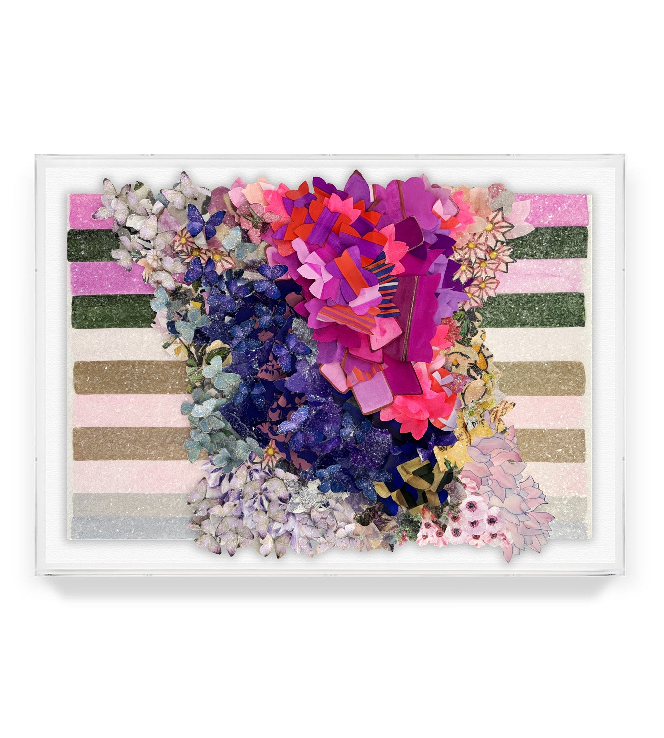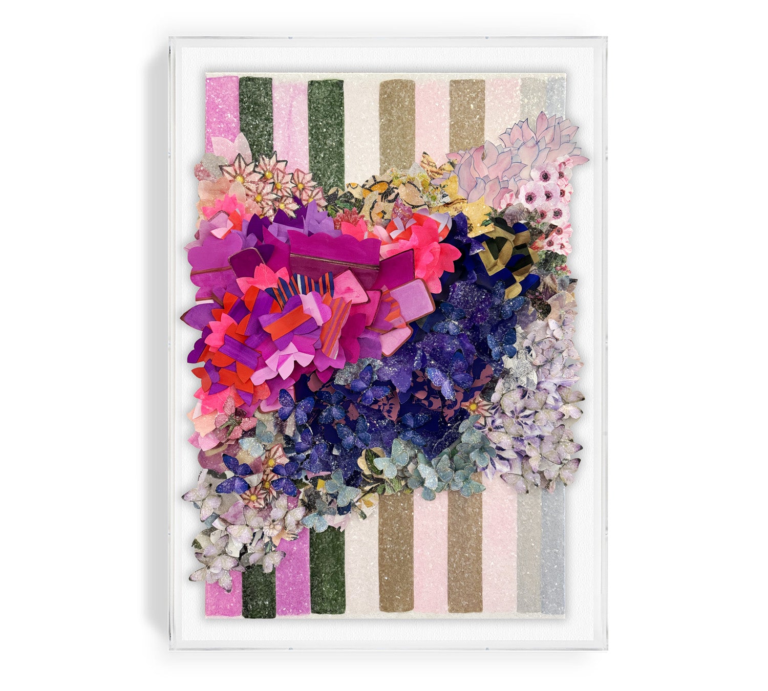 Original, one-of-a-kind collage from Kristi's 3D Bloom series. Created with mixed media including found objects, personal illustrations and photography on canvas and costed in cut glass glitter/crystals.